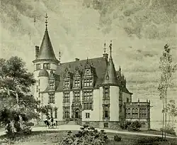 Das 1898 fertiggestellte Schloss entstand im Stil der Neorenaissance zum Preis von etwa 378.000 Mark. Vorbild waren die Schlösser der Loire in Frankreich. Das Schloss ist zweigeschossig und weist einen stark gegliederten Baukörper mit Türmen, Giebeln und Erkern auf. Das steile, nach Norden abgewalmte Satteldach ist gekennzeichnet durch zahlreiche Zwerchgiebel, die der Belichtung der im Dach befindlichen Wohnräume dienen. Das Kellergeschoss ist durch das zum See hin abfallende Gelände auf der Ostseite unter der Terrasse vollständig sichtbar. Man betrat das Schloss durch eine Halle auf der Parkseite und erreichte von dort die Wohn- bzw. Präsentationsräume der Familie im Erdgeschoss mit dem Zimmer des Herrn, dem Salon und dem Zimmer der Dame. Des Weiteren gab es den Speisesaal, ein Rauchzimmer und einen Wintergarten. Von der Halle im Erdgeschoss aus erreichte man über den Treppenturm das Obergeschoss mit einem über der Halle liegenden Vorraum. Hier befanden sich auch das Schlafzimmer der Herrschaft, ein Ankleidezimmer und Gästezimmer. Über eine Nebentreppe gelangte man zum Dachgeschoss mit weiteren Gästezimmern, den Kinderzimmern und einem Fotoatelier. Die Küche befand sich im Kellergeschoss. Im Jahr 1899 schuf Max Liebermann für das Zimmer der Dame einen Zyklus von Wandbildern.[16] Zum Preis von 10.000 Mark wurden vier Bilder von ihm angefertigt, welche jeweils eine Jahreszeit darstellten. (Kurz nach dem Kriegsende 1945 kam es laut den Erinnerungen von Maria Herzer, einer Enkelin des Ehepaars Schnitzler, im Stockwerk über dem Zimmer mit den Malereien zu einem Wasserrohrbruch. Die aufgeweichten Bilder wurden abgerissen, um an die darunterliegenden Friese zu gelangen, welche zum Einwickeln der Füße genutzt wurden. Sie sind verloren und wurden in der Folge auch nicht als Kopie nachgearbeitet.)