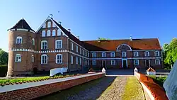 Das Herrenhaus geht anschließend durch Verkauf zunächst in den Besitz von Eske Brock (1560–1625) über und wird 1609 von Gert von Rantzau auf Breitenburg (1558–1627) erworben und bezogen. Dessen Sohn Christian zu Rantzau (1614–1663), 1650 Graf mit dem Wiener Doppeldiplom (Comitiv und Palatinat), 1653 de facto Reichsgraf auf der Wetterauischen Grafenbank des Reichstags zu Regensburg, wie auch 1654, war bereits 1648 Statthalter der Herzogtümer und wurde 1661 Oberstatthalter der dänischen Krone. Christian Rantzau errichtete im Jahre 1642 den Südturm. Da das Wappen der Rantzau einen goldenen Löwen aufweist nennen sie das Gut ab 1647 Løvenholm. Es wird damit Teil der 1650 durch kaiserliche Verfügung kreierten reichsunmittelbaren Grafschaft Rantzau. Die Zeit der Rantzaus auf Løvenholm endete 1726 nach der Ermordung des dritten Reichsgrafen Christian Detlef zu Rantzau[1] im Jahr 1721, angeblich im Auftrag durch seinen Bruder, den 4. und letzten Reichsgrafen Wilhelm Adolf zu Rantzau (1688–1734 Festung Akershus/Norwegen), der bereits 1722 in Rendsburg festgesetzt worden war und bis zum Tod in Festungshaft verblieb. Obwohl er als reichsunmittelbarer Reichsstand ausschließlich dem Kaiser und den höchsten Reichsgerichten unterstand klagte ihn die dänische Krone vor einem königlich-dänischen Gericht an, weil er auch dänischer Lehnsgraf von Løvenholm war. Ein geheimer Erbvertrag mit der dänischen Krone, den der zweite Reichsgraf Detlev zu Rantzau mit König Frederik III. geschlossen und später widerrufen hatte – für den Fall ausbleibender männlicher Erben sollte die Reichsgrafschaft an die dänische Krone fallen – hielt der Klage der Schwester Catharina der beiden Brüder nicht stand: ihr wurde außer der Reichsgrafschaft der gesamte Güter-Besitz restituiert, allerdings mit dem Haken, dass sie die Gerichtskosten in Höhe von 230.000 Reichsthalern zu tragen habe. Sie musste zur Erhaltung von Breitenburg vieles verkaufen. Drage zum Beispiel erwirbt die dänische Krone und schenkt sie dem Schwager von König CHRISTIAN VI., Friedrich von BRANDENBURG-KULMBACH zur Hochzeit. Auf gleichem Weg gelangt LOEVENHOLM 1732 in den Besitz des nun zum dänischen Lehnsgrafen erhöhten Frederik Danneskiold-Samsoe (1703–1770).