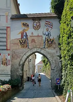 Durch einen gotischen Torbogen, der ein Rest der mittelalterlichen Burgbefestigung ist, führt die Berggasse zum Schloss Lamberg. Das Burgtor zeigt eine plastische Darstellung des Lamberg-Wappens und ein Fresko mit zwei ganzfigurigen Rittern vor dem Hintergrund des mittelalterlichen Steyr.[10] Kaiser Friedrich III. und sein Sohn Maximilian I. sind hier dargestellt. In Anlehnung an die Gründungssage der Burg Steyr werden die beiden auch als jene Ritter interpretiert, die durch einen Zweikampf den Standort der Burg ermittelt haben. Das 1949 entstandene Fresko ist die erste Arbeit Otto Götzingers in Steyr.[17] Eine Malerei mit zwei Rittern befand sich zunächst am Ennstor und wurde nach dessen Abbruch 1864 am Mauthäusl in der Haratzmüllerstraße neu ausgeführt. Da diese Malerei nach Ende des Zweiten Weltkriegs bereits in sehr schlechtem Zustand war, wurde Götzinger für die Neufassung am Unteren Burgtor beauftragt.[18]