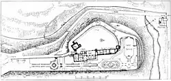 Die Anlage hat einen nahezu halbkreisförmigen Grundriss und steht in etwa 65 Meter Höhe auf einem Bergsporn an der August-Thyssen-Straße. Das Schlossplateau wird an seiner West- und Nordseite von einer bis zu 13 Meter hohen Ringmauer aus Ruhrsandstein mit einem wohl früher überdachten Wehrgang, der nur noch teilweise erhalten ist, begrenzt.[1] Ebenso wie der Bergfried gehört die Ringmauer größtenteils zu der ursprünglichen Bausubstanz des 13. Jahrhunderts. An die Ost- und Südseite des Schlossareals grenzen Gebäude, die mit Schiefer gedeckte Dächer besitzen.