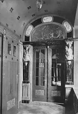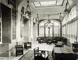 Im Erdgeschoss führt ein kleiner Flur mit einer Wandverkleidung aus Marmor und einem Tonnengewölbe mit vergoldeten Stuckaturen vom Portal zu einer großen Halle. Sie ist mit Kamin und halbhoher Eichenholztäfelung der Mittelpunkt der Repräsentationsräume. Von dort führt eine breite Treppe in das Obergeschoss sowie ein kleiner Flur durch ein Rundbogenportal in einen als Empfangszimmer dienenden Salon. Dieser ist im Stil des französischen Klassizismus ausgestattet. Eine niedrige Täfelung und eine Einfassung der Stuckdecke in den Farben Weiß und Gold umfassen eine Wandbespannung aus gelbem Stoff. An der Nord- und Ostwand stehen zwei große Marmorkamine.