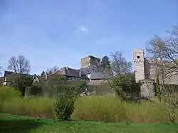 Die ursprüngliche Burg ließ sich durch einen Damm in eine Wasserburg verwandeln. Heute ist als Bauteil aus dem 13. Jahrhundert lediglich der quadratische Bergfried im romanischen Baustil erhalten. Die übrigen Befestigungen, eine Ringmauer und eine acht Meter hohe Schildmauer mit zwei Flankierungstürmen, weisen Elemente der Gotik auf und entstanden im 14. oder 15. Jahrhundert. Vermutlich bereits ab der Mitte des 14. Jahrhunderts diente die Burg nicht mehr als Rittersitz, sondern in erster Linie als Wirtschaftshof.