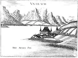 1552 erwarb Wolfgang Lasser die Fischereilehen.[2] Wolfgang Lasser (Lassa), Ahnherr der Salzburger Lasser von Lasseregg (Lassereck), ließ um 1555 auch einen Bauernhof in Unterach errichten. Dieser wurde von den Pächtern Georg Stauffer (1596), Blasius Dalionoso (1622) und Adam Dichter (1627) verwaltet. 1628 ließ Friedrich Lasser zu Lassereck den Hof in ein Schloss umbauen („Schloss Unt(e)rach“). Matthäus Lasser besaß das Schloss im Jahr 1630.[3] Nach dessen Tod erbten es seine beiden Söhnen Ferdinand und Friderico, welche offenbar die letzten Abkömmlinge des oberösterreichischen Zweiges dieser Adelsfamilie waren.[4]
