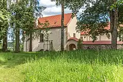 Die Dreiflügelanlage ist von einer Mauer und von einem gut erhaltenen Wallgraben umgeben. Westseitig befindet sich wohl der Halsgraben einer ehemaligen Burg aus dem 12. Jahrhundert.