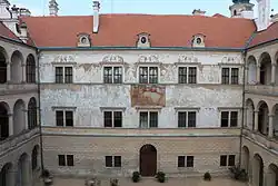 Das Sgraffito an den Rustika-Außenwänden schuf Šimon Vlach. Die weitgehend einheitliche Fassade wird von unterschiedlichen Renaissancegiebeln geschmückt. Der Südflügel im dritten Geschoss von neun Arkadenbögen unterbrochen. Das Hauptportal ist mit dem pernsteinischen Wappen verziert, das einen Auerochsen mit Nasenring darstellt.