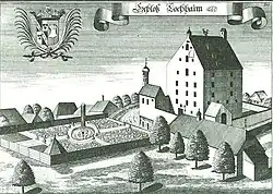 Früher stand dort eine Turmhügelburg. Im Laufe des 16. Jahrhunderts wurde eine Wasserschlossanlage errichtet, die 1723 durchgreifend erneuert wurde. Der Stich von Michael Wening von 1721 zeigt einen viergeschossigen Bau mit Satteldach und einige Gaupen. Zwei Kamine sind als Dachreiter gestaltet. Neben dem Wohnbau ist die Schlosskapelle St. Valentin (um 1714 entstanden) zu erkennen, die an der Südostecke angebaut ist. Beide sind durch eine nicht allzu hohe Mauer und einen Wassergraben geschützt. Außerhalb der Anlage sind Wirtschaftsbauten und ein eingezäunter Schlosspark mit einem Brunnen, aus dem eine Wasserfontäne aufsteigt, zu erkennen.