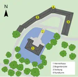 Die drei Trakte der Wirtschaftsgebäude haben einen grob halbkreisförmigen Grundriss und umschließen einen Innenhof. Sie stammen vornehmlich aus dem 17. Jahrhundert, wobei Türen und Fenster im 19. Jahrhundert verändert wurden.[14] Im Winkel zweier Gebäudeflügel steht ein wuchtiger Rundturm mit polygonaler Haube und zwiebelförmigem Abschluss. Sein stark abgestufter Sockel stammt noch vom Hauptturm, der Anfang des 18. Jahrhunderts abgerissen wurde.[14] Der rundbogige Eingang führt in sein Erdgeschoss mit Kuppelgewölbe.[11] Über der Eingangstür findet sich eine Blausteinplatte mit den Wappen von Harscamp/von Rolshausen. Gemeinsam mit einem weiteren, aber wesentlich kleineren Rundturm in der Südwest-Ecke der Anlage und einem geringen Stück Umfassungsmauer ist der Turmsockel die einzige Bausubstanz, die noch von dem unter Pontz I. von Welkenhuysen errichteten Vorgängerbau des Schlosses stammt.[1]
