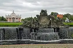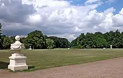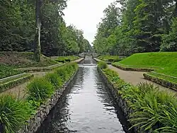 Um in der eigentlich trockenen Region der Griesen Gegend ausreichend Wasser für die Fontänen und Kaskaden zur Verfügung zu haben, wurde von 1756 bis 1760 der 28 Kilometer lange Ludwigsluster Kanal von der Stör bis zur Rögnitz ausgehoben.[57] Er diente zugleich als Transportweg für das benötigte Baumaterial der 1764 begonnenen Arbeiten.[3] Zur Unterbringung eines Wasserbehälters und der Pumpenanlagen für die Fontänen entstand 1751–1753 im hinteren Parkbereich ein Fontänenhaus nach Plänen von Legeay. Das Fontänenhaus gilt als ältestes Gebäude der Stadt Ludwigslust und konnte 2004/2005 saniert werden.[19] Wie sich Plänen von 1763/64 entnehmen lässt,[58] bestand der nach dem Muster französischer Schlossparks angelegte Gartenbereich aus einer zentralen Hauptachse und mehreren Nebenachsen. Auf zwei an das Schloss anschließende Boulingrins folgten Broderieparterres und die Hofdamenallee, die möglicherweise durch einen Graben als Abzweigung des Großen Kanals ergänzt werden sollte[58] und als zentrale Sichtachse mit dem Schloss und der Hofkirche eine durchgehende Linie bildete. Den Garten zierten Skulpturen nach antiken Vorbildern römischer Kaiser, die aus dem Ludwigsluster Carton gefertigt und wetterfest imprägniert waren.[16] Östlich des Schlosses, an das Pumpenhaus grenzend, befand sich der formal gestaltete Küchengarten, westlich das naturbelassene, von Schneisen durchzogene und mit einem vierzehnstrahligen Jagdstern versehene herzogliche Jagdrevier. Mit der Umgestaltung der Gärten in einen Landschaftspark vom Ende des 18. bis in die Mitte des 19. Jahrhunderts ging die spätbarocke Gestalt der Anlage verloren, Teile der Grundstruktur blieben jedoch bis in die Gegenwart erhalten. Von den einstigen strahlenförmigen Sichtachsen sind die Hofdamenallee, der Große Kanal und der zweiseitig von Wasser umgebene Johannisdamm die Hauptachsen des Gartens; mit der Friedrich-Naumann-Allee ist eine weitere Sichtachse im Ludwigsluster Stadtgebiet aufgegangen. Thomas Nugent schrieb 1755 über die Gartenanlagen: