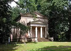 Im südlichen Bereich des Schlossparks, hinter dem Kleinen Marstall, befindet sich ein weiterer Kirchenbau. Das Helenen-Paulownen-Mausoleum wurde 1804 bis 1806 für die Großfürstin Helena Pawlowna, Gemahlin des Erbprinzen Friedrich Ludwig von Mecklenburg und Tochter von Zar Paul I. errichtet und enthielt zugleich eine kleine russisch-orthodoxe Kapelle. Es ist ein klassizistischer Tempelbau, für dessen Errichtung vermutlich der französische Architekt Joseph Ramée verantwortlich zeichnete.[65] Im gesamten Park befinden sich zahlreiche Denkmäler und Standbilder. Das von Rudolf Kaplunger um 1788 gefertigte Denkmal für Herzog Friedrich den Frommen nördlich der Grotte ist eine von einem schmiedeeisernen Schmuckzaun eingefasste Sandsteingruppe auf einem Piedestal. Das Denkmal stand einst auf einer kleinen von Pappeln umgebenen Insel, deren Wassergräben später zugeschüttet wurden. Eine an Großherzog Friedrich Franz III. erinnernde Büste von Hugo Berwald befindet sich seit 1936 am Übergang des Rasenparterres zum Blumengarten, ein Bronzestandbild seines Ururgroßvaters Friedrich Franz I. steht auf dem Schlossplatz vor dem Altan. Das Pferdedenkmal am Forsthaus ist ein vor 1785 erbautes Grabmal für das Lieblingspferd des Herzogs Friedrich; ein 1922 geweihtes Ehrenmal von Hugo Berwald erinnert an die gefallenen Mitglieder des Jägerbataillons.