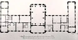 Das Schloss enthält auf vier Etagen rund hundert Innenräume. Der weitgehend symmetrische Grundriss lehnte sich an Entwürfe Jacques-François Blondels an.[27] Die Beletage des Herzogspaares lag im ersten Obergeschoss, darüber befanden sich seit Beginn des 19. Jahrhunderts die Räume des Thronfolgers.[34] Das Erd- und das Mezzaningeschoss nahmen Gästewohnungen auf,[34] im Mezzanin ist künftig die Schlossverwaltung untergebracht. Die schmalen Flügelbauten beherbergen im westlichen Bereich der Hauptetage Kabinette, im östlichen Bereich eine große Galerie, die aber durch eine Vielzahl von Umbauten des 20. Jahrhunderts in ihrer Struktur verändert wurde. In den östlichen Trakten des Schlosses befanden sich im ersten Geschoss die Wohn- und Paradezimmer des Herzogs, in den westlichen Trakten die der Herzogin.[11] Sie sind aufgeteilt nach Art des Appartement double in einen offiziellen, gartenseitigen Bereich mit an die Treppenhäuser grenzenden Audienzräumen und anschließenden Salons und in die südlichen privaten Wohn- und Schlafzimmer zum Hof.[34] Das Schloss besitzt kein Hoftheater, die Schauspielkunst war in der Regierungszeit Herzog Friedrichs als „unsittlich“ verboten.[10]