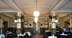 Im pavillonartigen Mitteltrakt des Bauwerks befinden sich die großen Gesellschaftssäle, die zu beiden Seiten von den Haupttreppenhäusern und den Appartements flankiert werden.[27] Der Hauptzugang des Schlosses wird von einem durch toskanische Säulen gestützten Altan gebildet, der direkt in das Vestibül führt. Dieses ist der zentrale Verbindungsraum des Untergeschosses, durch den die Treppenhäuser und der Jagdsaal erreicht werden können. Der mit Trophäen geschmückte Jagdsaal ist der große Gesellschaftssalon des Untergeschosses. Er geht in seiner Konzeption auf eine Sala terrena zurück, einen Gartensaal, der seine heutige Gestalt nach Umbauarbeiten ab 1878 erhielt. Dieser Raum, in dem an Festtagen auch Hofgottesdienste abgehalten wurden, beherbergt heute die Schlossgaststätte. Die Möblierung der Innenräume stammte zum Teil aus den zu jener Zeit kaum noch bewohnten Schlössern in Güstrow und Dargun,[35] zusätzliches Mobiliar wurde in Ludwigsluster Werkstätten nach englischen und französischen Vorbildern hergestellt.[27] Einige Stücke gelangten als Geschenke an den Hof, so zum Beispiel ein auf Entwürfen Schinkels beruhender Bronzetisch mit Spiegelplatte aus der Mitgift der Prinzessin Alexandrine von Preußen und mehrere in St. Petersburg gefertigte Prunkvasen des russischen Zarenhofs.[36] Zwei aus dem Besitz der französischen Königin Marie-Antoinette stammende Schränke gingen nach dem Zweiten Weltkrieg verloren.[17]