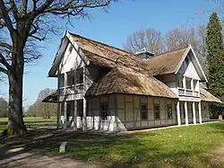 Die gesamte Gartenanlage ist mit zahlreichen größeren und kleineren Bauwerken geschmückt, die zum Teil in den Gärten verborgen als Überraschungsmoment, zum Teil schon von Weitem sichtbar als Blickfänge dienen. Bereits im Barockgarten des Jagdschlosses befanden sich kleinere Pavillons und ein Lusthaus,[2] von denen jedoch keine Spuren mehr vorhanden sind. Durch Kriegsschäden und Verfall gingen nach 1945 außerdem der im chinesischen Stil errichtete Affentempel von 1770 und der Rosentempel aus dem 19. Jahrhundert verloren.[47] Zu den ältesten erhaltenen Gartenarchitekturobjekten gehört die östlich der Hofdamenallee gelegene Grotte von 1788.[62] Sie ist ein unter Johann Joachim Busch errichtetes Bauwerk aus Raseneisenstein, das als künstliche Ruine an die Vergänglichkeit des Menschen im Sinne Rousseaus erinnern und sentimentale Gefühle wecken soll. Neben ihrer romantisch-dekorativen Funktion diente sie als Eiskeller auch praktischen Zwecken. Westlich der Hofdamenallee, auf Höhe der Grotte befindet sich das Schweizerhaus, ein im Cottagestil um 1790 erbautes Gebäude, das Busch als Sommerhaus für Herzogin Luise errichtete. Das Schweizerhaus wurde im 19. Jahrhundert zeitweise vermietet, später diente es als Tagungsgebäude und im 20. Jahrhundert zeitweise als Jugendherberge.[63][64] Das neunachsige Bauwerk ist durch dreiachsige Mittelrisalite betont, durch seine einfache Ausführung in Fachwerk und das mit Reet gedeckte Dach aber bewusst einfach gehalten.[65] Im Inneren ist die alte Raumstruktur weitgehend erhalten geblieben. Im Dachgeschoss befindet sich ein großer Festsalon, der mit alpinen Szenen und Wappen Schweizer Kantone ausgeschmückt ist.[65] Das Schweizerhaus verweist mit seinen schlichten Bauformen und Materialien auf die für das ausgehende 18. Jahrhundert typische ferme ornée im Stil der Hameaus von Versailles und Chantilly. Um die romantische Inszenierung eines ruralen Landsitzes zu perfektionieren, wurden auf den Rasenflächen rund um das Sommerhaus zeitweise Rinder gehalten. Der Schriftsteller Stephan Schütze beschrieb die ländliche Idylle in einem Reisebericht von 1812: