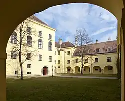 Nach Pfandinhaberin Polheim und Breuner als Leibgedinge zweier Kaiserwitwen wurde das Schloss 1701 verkauft und ging 1705 an Christoph Ernst Graf von Fuchs zu Bimbach und Dornheim. Von etwa 1719 bis spätestens 1740 erfolgte der Ausbau zur barocken Schlossanlage unter Maria Karolina Gräfin von Fuchs-Mollard, der Witwe von Christoph Ernst und Obersthofmeisterin von Maria Theresia. Das Schloss blieb mit der Herrschaft Scharfeneck bis zum Tod von Gräfin Fuchs 1754 in deren Besitz. Die Töchter der Gräfin veräußerten die Herrschaft mit dem Schloss an Kaiser Franz Stephan von Lothringen, der sie neben anderen Herrschaften seiner Tochter Marie Christine und deren Mann Albert von Sachsen-Teschen übertrug. Bis 1918 blieb das Schloss in kaiserlichem Privatbesitz, danach folgten der Kriegsgeschädigtenfonds, der Habsburgische Familienfonds und in der NS-Zeit die Heeresverwaltung als Eigentümer. Seit 1942 befindet sich das Schloss in Gemeindebesitz, es wird heute als Sitz des Stadtamtes, als Veranstaltungsort und als Wohnhaus genutzt. Seit 2006 beherbergt das Schloss aus die museale Sammlung der Edmund-Adler-Galerie.