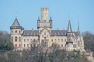 Schloss Marienburg ist eine neugotische Vierflügelanlage, die König Georg V. von Hannover von 1858 bis 1869[2] als Sommerresidenz auf dem Marienberg in Pattensen (Region Hannover) erbauen ließ. Das historistische Schloss war ein Geschenk an seine Ehefrau, Königin Marie, zu ihrem 39. Geburtstag am 14. April 1857. Königin Marie und ihre Tochter Mary bewohnten das Schloss von 1866 bis 1867. Nach ihrer Abreise ins Exil wurde das Schloss fast 80 Jahre lang nur vom Hausmeister und ab 1945 vorübergehend von Flüchtlingen und von der Familie von Ernst August (III.) bewohnt.