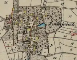 In Menderdorf befand sich als mittelalterlicher Sitz ursprünglich ein freistehender Turm; wie bei ähnlichen Bauten des hohen Mittelalters wird der Turm fünfgeschossig gewesen sein, mit einem Kellergeschoss, zwei darüber liegenden Wohngeschossen, die über eine Außentreppe erreichbar waren, und zwei weiteren Speichern und einem schindelgedeckten Zeltdach. An den Turm wurden später zwei Gebäude angebaut. Eine kleine Kapelle stand nördlich des Schlossensembles, Brunnen und Backofen lagen östlich des Schlosses.[2] Auf der Karte des Christoph Vogel von 1600 ist ein Schloss mit einem dahinter stehenden Turm eingezeichnet. Das Schloss war 1788 noch vorhanden. 1827 wurde die Schlosskapelle zu einem Stadel umfunktioniert. Im Kataster von 1830 ist im Flurstück 28 der Turm noch eingezeichnet, 1843 wird kein Schloss mehr in Mendorferbuch erwähnt. Wahrscheinlich wurden die Besitztümer zertrümmert und einzeln verkauft.
