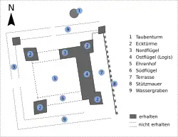 Von dem ehemals vierflügeligen Schloss Montbras sind heute nur noch der östliche und etwa die Hälfte des nördlichen Flügels sowie die vier Ecktürme erhalten. Sie stehen auf einem nahezu quadratischen Schlossgrund, der früher an drei Seiten von in den Fels gehauenen Trockengräben umgeben war. An der vierten, östlichen Seite befindet sich heute noch eine Terrasse, die von einer zehn bis zwölf Meter[17] hohen Mauer gestützt wird. Nördlich des Schlosses liegt die ehemalige Vorburg, die eine Hufeisenform besitzt. Zur Vorburg zählt auch ein mächtiger Rundturm, der früher als Taubenschlag diente. Die rundbogigen Eingänge der einstigen Ställe besitzen Schlusssteine in Form von Nutztieren.