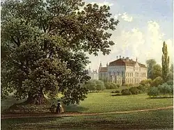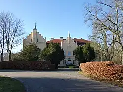 | Gebäude von kastellartiger Geschlossenheit, der zweigeschossige Hauptbau zehnachsig mit übergiebeltem Mittelrisalit. Kernbau von 1705, Umbau zur Dreiflügelanlage 1735–1737. Fassaden 1848 gotisierend im sogenannten Normännischen Stil überformt. | |