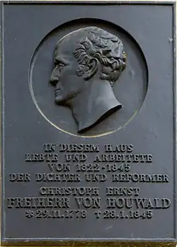 Von 1822 bis 1845 lebte und arbeitete der Dichter und Reformer Christoph Ernst von Houwald im von ihm am 2. Juni 1822 für 9.000 Taler erworbenen Schloss Neuhaus. Eine Gedenktafel am Haus erinnert an ihn. In dieser Zeit entwickelte sich Schloss Neuhaus zu einem Treffpunkt bekannter Persönlichkeiten. Bettina und Achim von Arnim, Emanuel Geibel, Adelbert von Chamisso, Friedrich de la Motte Fouqué, Ludwig Tieck, Franz Grillparzer, Julius Eduard Hitzig und die Gebrüder Christian Jakob und Karl Wilhelm Salice-Contessa gehörten zu den Gästen des Hauses. Letzterer, ein Freund Houwalds, lebte von 1821 bis 1824 im Schloss.[1] Christoph Ernst von Houwald wurde bei der nahegelegenen Dorfkirche Steinkirchen beigesetzt. Die Witwe Houwalds, Auguste von Houwald, verkaufte 1845 das Anwesen an den Neffen und Landrat Karl von Houwald. Nach dessen Tod im Jahr 1883 lebte seine Witwe Veronica von Houwald bis 1913 in dem Herrenhaus. Es wurde dann von Franz von Poncet erworben, der jedoch bereits 1914 im Ersten Weltkrieg fiel. Das Neuhaus ging an die Stände der Markgrafschaft Niederlausitz, die es verpachteten. 1931 pachteten Albrecht und Helene von Houwald das Haus. Der spätere deutsche Diplomat Götz von Houwald (1913–2001) lebte in seiner Jugend einige Zeit im Schloss Neuhaus.