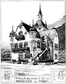 - ↑ Die deutsche Villa. Entwürfe hervorragender Architekten und Baumeister. (Mappenwerk in insgesamt 25 Lieferungen) Ch. Claesen & Cie., Berlin ab 1888 (1891?). (Digitalisat auf www.digitale-sammlungen.de – vergleiche Bilddatei im Artikel)