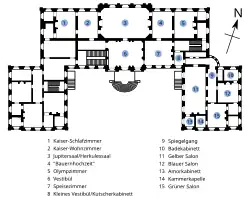 Westlich schließen sich dem Jupitersaal die Kaiserzimmer an, die mit ihrem Namen an die Besuche Kaiser Karls VI. und Franz Stephans I. in Nordkirchen erinnern. Im ersten Raum, dem Kaiser-Wohnzimmer, zeigt das Deckengemälde himmelstürmende Titanen, während die Supraporten Porträts der Kölner Kurfürsten sind. Im Deckengemälde des zweiten Zimmers, das einst als Schlafzimmer für hochgestellte Besucher diente, bringt Prometheus den Menschen das Feuer. Das Bett, das dort stand, ist heute im Museum der Burg Altena zu sehen.[95] Das sich östlich des Festsaals anschließende Ostappartement besteht – ebenso wie das Westappartement mit den Kaiserzimmern – aus zwei Räumen und einem anschließenden kleinen Kabinett. Der erste Raum wird Bauernhochzeit genannt. Der Name geht auf Tapisserien mit holländischen Motiven zurück, die früher in diesem Zimmer die Wände zierten. Das Gemälde der Stuckdecke von Johann Martin Pictorius zeigt Ceres und Bacchus, zwei große Porträts an den Wänden stellen den Kurfürsten Maximilian II. Emanuel von Bayern und seine Frau Therese Kunigunde von Polen dar. Das zweite Zimmer dieses Appartements wird nach dem Motiv seines Deckengemäldes Olympzimmer genannt. Seine Supraporten zeigen vier Sinne. 1910[96] ließ der damalige Schlossbesitzer den Raum durch Entfernen einer Trennwand mit der Bauernhochzeit zu einem großen Zimmer vereinen. Bei den Restaurierungsarbeiten in den 1970er Jahren wurde der Originalzustand wiederhergestellt. Dabei wurden auch die Wände aller Räume, ausgenommen der des Festsaals, mit Seide bespannt, die nach alten Mustern gewebt worden war.[97]