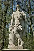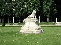 Duchênes Garten orientierte sich jedoch nicht am barocken Schlaun-Entwurf, sondern hatte eine vollkommen eigenständige Form. Aus dem schmalen Landstreifen nördlich des Schlossgebäudes wurde 1908/1909 eine Terrasse, von der eine neue 40 Meter lange Treppenanlage als Ersatz für die eiserne Weyhe-Brücke direkt zum neuen Gartenparterre führte.[55] Der Schlossteich nördlich der neuen Garteninsel erhielt als neue Begrenzungen an der Nord- und Südseite große Freitreppenanlagen mit plastischem Schmuck. Am Rand der nördlichen Marmortreppe sollten Skulpturen liegender Figuren aufgestellt werden, welche die vier Flüsse Rhein, Tiber, Nil und Euphrat darstellen sollten, jedoch sind nur der Rhein und der Tiber tatsächlich verwirklicht worden.[56] Die Figuren waren nur einige von sehr vielen, mit denen der Herzog von Arenberg den bis 1911[57] weitgehend fertiggestellten Inselbereich des Nordgartens ausstatten ließ. Teilweise handelte es sich dabei auch um Kopien älterer Statuen aus dem 18. Jahrhundert.