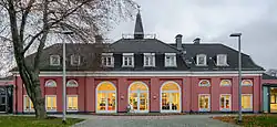 Die Nord- und die Südseite des Schlosshofs werden von zwei Flügelbauten begrenzt, die über eingeschossige, rundbogige Trakte mit dem Kleinen Schloss verbunden sind. Der gesamte Gebäudekomplex diente früher als Wirtschaftshof, der nördliche Flügelbau wurde als Pferdestall genutzt.[1] Im Südflügel des Schlosses befindet sich die Gedenkhalle, die 1962 als erste NS-Gedenkstätte in Westdeutschland gegründet wurde und sich seitdem in städtischer Trägerschaft befindet. Vor der Gedenkhalle befindet sich die ebenfalls 1962 eingeweihte Basaltstatue Die Trauernde des umstrittenen Bildhauers Willy Meller. Skulptur sowie Bildhauer werden schon seit Jahren kritisiert.[2]