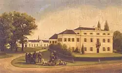 Die klassizistische Anlage besteht aus zwei Gebäudekomplexen, die einen quadratischen, etwa 50 mal 50 Meter großen Innenhof begrenzen. Die Fassaden sind rosa gestrichen, Gesimse sowie Fenster- und Türfassungen in Weiß abgesetzt.