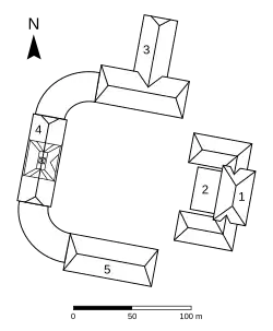 1 Herrenhaus, 2 Glasvorbau, 3 Restaurant, 4 Kleines Schloss, 5 Gedenkhalle