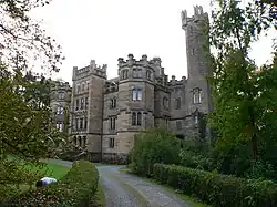 Die Jahreszahl 1864 steht groß über dem Hauptportal der Ostseite, durch das man in die Vorhalle im Erdgeschoss gelangt. Gestaltung und Einrichtung der Gemächer erinnern an eine bereits beim Bau des Schlosses längst vergangene Zeit. So erinnert die Ausstattung des Salons im ersten Obergeschoss an den Stil Napoleons III., andere Räume, wenn sie auch nicht so prunkvoll ausgestattet sind, an die Schlösser Ludwigs II. Besonders originell präsentiert sich das maurische Esszimmer im nordwestlichen Eckturm, das Dekorationen der Alhambra in Granada bis ins kleinste Detail nachahmt. Bemerkenswert sind auch die aus verschiedenen Hölzern kunstvoll gestalteten Parkettböden.[7]