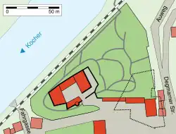Im Südwesten befindet sich der dreigeschossige Hauptbau, dem im Nordosten ein zweigeschossiges Gebäude gegenüberliegt. Auf der dem Fluss zugewandten Seite verbindet beide ein Zwischentrakt. Zum Dorf hin schließen die Umfassungsmauer und der Turm die Anlage ab.