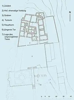 Auch wenn neuzeitliche Umbauten den ursprünglichen Charakter der Burg verändert haben, sind die Hauptelemente der Anlage aus dem Mittelalter noch erkennbar. Die Anlage wird dominiert vom ältesten Teil der Anlage, dem siebenstöckigen Bergfried im Zentrum mit einem Grundriss rund 11 × 11 Meter und einer Mauerdicke von 1,6 Metern. Neueren Datums sind die Gewölbe in den unteren Geschossen; in den oberen haben sich Lauben, Aborterker und Fensternischen erhalten. Der Turm wird abgeschlossen durch einen Zinnenkranz und einem Zeltdach. Dieses bestand ursprünglich aus einer leichteren Konstruktion, damit es bei Gefahr entfernt werden konnte. Das eigentliche Dach, ein nach Westen abfallendes Pultdach aus starken Balken, war in den Turm gehängt und unterhalb der Zinnen angebracht. Ursprünglich war der Turm von einem trapezförmigen Bering umgeben, der im Lauf der Jahrhunderte nach und nach überbaut wurde.