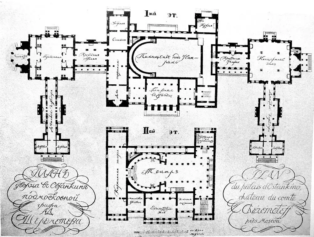 Nachdem Nikolai Scheremetew in seinen Häusern in Kuskowo, Moskau-Kitai-Gorod und Markowo (bei Ramenskoje) Haus-Theater eingerichtet hatte, ließ er 1792–1798 das Schloss Ostankino zum bedeutendsten Leibeigenen-Theater seiner Zeit umbauen mit Bühne, Zuschauersaal, Umkleideräumen und mechanischen Maschinen. Beteiligt waren die Architekten Giacomo Quarenghi, Vincenzo Brenna, Francesco Camporesi, Karl Blank, J. S. Nasarow und Iwan Starow. Die von Igor Grabar behauptete Beteiligung Wassili Baschenows ist umstritten.[6] Das Theater wurde 1795 eröffnet. Es wurden Opern, Ballette und Komödien aufgeführt. Dabei überwogen die komischen Opern von Nicolas Dalayrac und anderen. Als erster in Russland wandte sich Scheremetew den Reformopern von Gluck zu. Nur die Saison 1797 war öffentlich mit Vorstellungen für Kaiser Paul I. und den abgedankten polnischen König Stanislaus II. August Poniatowski. 1804 nach dem Tode Gräfin Praskowja Scheremetewas, der Frau Nikolai Scheremetews, wurde der Betrieb des Leibeigenen-Theaters eingestellt. Die prächtige Innenausstattung des Schlosses hat sich erhalten, Die Säle mit vergoldeten Holzschnitzereien und das kunstvoll gestaltete Parkett sind Hauptsehenswürdigkeiten. Die Kronleuchter und Möbel befinden sich an ihren ursprünglichen Orten.