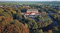 Im Dreißigjährigen Krieg konnte sich die Burg gegen ein schwedisches Korps unter General Hans Christoph von Königsmarck und gegen kaiserliche Truppen unter General Gallas halten. Otto Ludwig von Veltheim ließ ab 1713 die alten Gebäude abreißen und durch den französischen Architekten Louis Remy de la Fosse ein Schloss im Stile des französischen Barock erbauen. Es zählt zu den wertvollsten Barockbauten des Landes Sachsen-Anhalt. Den Raumkomplex füllten Treppenhäuser, Bogenhallen, Zimmerfluchten, Stucksäle mit Fayenceöfen, Supraporten, Panneaux und Porzellankammern. Vor dem Schloss wurde im 18. Jahrhundert ein Beamtenhaus errichtet, an das sich beiderseits niedrigere Gebäudeflügel in unterschiedlicher Gestaltung anschließen. Durch die Gegebenheiten der Insellage und der Vorgängerbauten erscheint die Struktur der Anlage etwas seltsam, der Ehrenhof öffnet sich mit seinen Seitenflügeln zur Rückseite hin auf den Halbrund der Schlossinsel, der einst durch einen Formalen Garten gestaltet war. Der Park erstreckt sich jenseits der Schlossinsel in der Achse eines Seitenflügels; ursprünglich ebenfalls ein Barockgarten, wurde er vom Berghauptmann Franz von Veltheim als Englischer Landschaftsgarten umgestaltet. Einst eröffnete er Durchblicke auf das Kloster Petersberg. Ein Mühlenteich wurde in einen See mit Inseln verwandelt, unter alten Bäumen stehen Gedenksteine mit Brunnen und Inschriften. Am Brückeneingang zur Schlossinsel erhob sich ein hohes Tor mit zwei seitlichen Fußgängerportalen; mächtige Torflügel, gestreift in den Familienfarben, gewährten oder versperrten den Zugang. Von der Mauer, bekrönt von einem Volutenaufsatz mit Wappen, die an ein verschwundenes Ökonomiegebäude anschloss, ist nur noch ein Stummel mit einem der Fußgängerportale vorhanden.