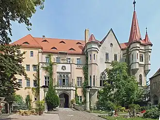 Das Schloss ist eine unregelmäßige Dreiflügelanlage, die sich um einen Innenhof von etwa 200 m² gruppiert. Die Nordseite ist durch einen einstöckigen zinnenbekrönten Wehrgang abgeschlossen. In der Südostecke des Hofes erhebt sich ein die dreistöckigen Gebäude übertreffender, ebenfalls mit Zinnen versehener Treppenturm. Der als Brücke gestaltete und von zwei Säulen mit Adlern flankierte Zugang zur Anlage führt in einen Torbogen des Westflügels. Dieser ist als Schauseite mit Balkonen und angesetzten Türmen verziert. Die äußere Südostecke ist ebenfalls turmartig und mit einem zweistöckigen gusseisernen Balkon gestaltet.