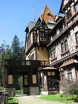 Das Fachwerk und die Erker des Schlosses erinnern sowohl an die rumänische k.u.k.-Zeit als auch an Hohenzollern. Verantwortlich für die Möbel und Innenausstattung war der Künstler Bernhard Ludwig. Die Königin war maßgeblich an der Gestaltung der Räume beteiligt.[2] Ein Teil der 99 Zimmer kann mittlerweile besichtigt werden. Das Schlossmuseum hat eine Ansammlung von Möbeln und dekorativen Gegenständen sowie eine wertvolle Kunst- und Geschichtssammlung.