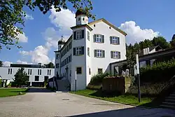 Das heutige historische Schloss Pfünz ist ein Neubau der Barockzeit. 1710 ließ es mitsamt einem großen Schlosshof Fürstbischof Johann Anton I. Knebel von Katzenelnbogen durch seinen Hofbaumeister Jakob Engel errichten.[4] 1745 erhielt der Hof durch den Stück- und Glockengießer Matthias Perner einen Brunnen; bei der Brücke über die nahe Altmühl war ein heute abgetragener Wasserturm zur Speisung der heute nicht mehr vorhandenen Springbrunnen errichtet. Der vorletzte Eichstätter Fürstbischof, Johann Anton III. von Zehmen, wollte das Schloss durch den Hofbaumeister Maurizio Pedetti wesentlich umgestalten und erweitern lassen; dessen Pläne kamen aber nicht zur Ausführung. Dem letzten Eichstätter Fürstbischof und nachmaligen Eichstätter und Bamberger Diözesanbischof Joseph Graf von Stubenberg wurde bei der Säkularisation zu Beginn des 19. Jahrhunderts das Schloss zur lebenslangen Nutzung überlassen; er lebte hier bis zu seinem Tod im Jahr 1824. Später kam es in Privatbesitz; so besaß es 1882 bis 1910 der Römer- und Limesforscher Friedrich Winkelmann, der hier als „Gutsbesitzer“ wohnte, dann bis 1916 der Münchener Akademieprofessor Franz Naager.[5] 1955 erwarb die Diözese Eichstätt das Schloss[6] und gestaltete es ab 1956 zum diözesanen Jugendhaus um, wobei das Barockschloss entsprechende Anbauten erhielt: 1957 der Umbau des Schlosses und ein Bettenhaus von Friedrich Ferdinand Haindl, 1969 ein Personalgebäude und einen Schweinestall mit Garage nach Plänen von Diözesanbaumeister Karljosef Schattner und Landschaftsplaner Gerhart Teutsch[7], 1982 und 1989 einen Neubau für Wohnunterkünfte und eine Kapelle nach Plänen des Münchner Architekten Franz Kießling[8] mit Lichtplaner Walter Bamberger[9] und zuletzt in den Jahren zwischen 2003 und 2005 ein zentrales Eingangsgebäude und ein neues Bettenhauses I bei Beibehaltung des Bettenhauses II nach Entwurf von Jörg Homeier und Gerold Richter.[10][11]