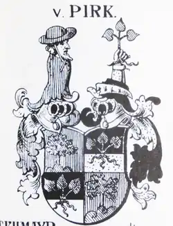 Es wird aufgrund frühmittelalterlicher Geschirrfunde vermutet, dass der erste Sitz der Pirker in der Turmhügelburg bei Pirkerziegelhütte bestand.[3] Wann die Pirker nach Pirk umgesiedelt sind, ist nicht bekannt. Das Geschlecht der Pirker ist in der Oberpfalz bis 1532 nachweisbar; nach Siebmachers Wappenbuch[4] werden ein Berthold von Pirk 1303 genannt, ein Friedrich 1308, ein Jordan Pirker zu Pirk 1446, Udalrich II. Birker tritt von 1479 bis 1486 als Abt von Kloster Waldsassen auf. Auch ein Chunrad der pirker kommt in einer Urkunde des Klosters Schönthal als czewgen vnd taydingter (also als Zeuge und Schiedsrichter) auf, Christoph Pirker zu Pirk erscheint zwischen 1486 und 1492 in der Landtafel von Herzog Georg der Reiche. Am 15. September 1488 verkauft Hans Pirker zu Pirk, Richter zu Luhe, seinen halben Hof, genannt Plochwerk, zu Rothenstadt an Wolfgang Beringer zu Weiden. Christoph Pirker zu Pirk hatte einen Weidener Bürger, der in Pirk ansässig war, pfänden und gefangen nehmen lassen. Daraufhin haben die Weidener das Dorf Pirk überfallen, den Pirker und einen seiner Söhne gefangen genommen und sein Vieh weggetrieben. Am 10. Januar 1502 wurde durch Ritter Ludwig von Eyb, Viztum der Pfalz, der Streit gütlich beigelegt. Am 22. Juni 1508 tritt Georg Pricker zu Birk als Urteiler der Leuchtenberger auf. In den pfälzischen Matrikeln sind 1527 noch die Pirker zu Prik aufgeführt. 1532 tritt Jacob Pircker zu Pirk bei einem Streit um 70 Gulden gegen den Landgrafen auf, der von Wolff Guttenstein vff Kysch vndd petersburg am 20. Januar 1532 entschieden wurde; trotz der Einigung musste Jakob Pirkner den geschuldeten Betrag später nochmals einfordern.