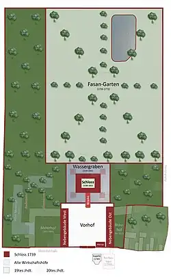 In dieser Umbauphase erhielten auch die Nord-Süd ausgerichteten Nebengebäude, ihre heutige Form und präsentieren sich als fünfmal so lange wie breite Gebäudekomplexe mit Lisenen-, Pilaster- und Quaderarchitektur und Satteldach. Die markant und auffällig schönen, giebelbekrönten Schmalseiten werden von Voluten flankiert. Die nördlichen Teile dieser Trakte (dessen Ursprungsbau aus der Zeit um 1600 stammt) sind von Anfang an als Wohngebäude definiert und zeigen sich mit repräsentativ großen Räumen die mit Holzbalken- und Spiegeldecken und Kachelöfen ausgestattet sind. Dies Ausgestaltung der Nebengebäude lässt vermuten, dass diese Trakte für den Verwalter vorbehalten waren. Südlich an diesen Wohntrakt schlossen die Wagenburg und die Stallungen an.[6] Westlich davon, von diesen Nebengebäuden getrennt, befanden sich die alten Wirtschaftsgebäude.[7]