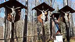 Nordwestlich von Schloss Possenhofen, parallel zum Seeufer, befindet sich ein Kalvarienberg, der gegen Ende des Dreißigjährigen Krieges nach einer Pestepidemie zwischen 1646 und 1648 entstand. Diese Andachtsstätte bildet zusammen mit Schloss Possenhofen und seinem Park ein Ensemble. Die Kreuzigungsgruppe und die Statue einer schmerzhaften Maria stammen von dem in Italien geschulten Hofbildhauer Balthasar Ableithner und sind aus Eichenholz gefertigt. Jahrhundertelang war der Kalvarienberg mit seiner künstlerisch herausragenden Kreuzigungsgruppe weithin sichtbar und landschaftsprägend. Er bot einen weiten Blick über den Starnberger See bis hin zur Alpenkette, der gerühmt wurde. Derzeit ist diese Sichtschneise durch Wildwuchs verdeckt.