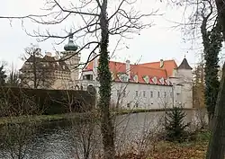 Das zweiflügelige neue Schloss, das mit den Außenfronten am Wasser steht, ist von achteckigen Türmen flankiert.