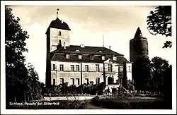 Ursprung des Schlosses ist die oben erwähnte Burganlage aus dem 10. Jahrhundert, deren Befestigungen neueren Erkenntnissen zufolge schon aus dem 9. Jahrhundert stammen.[9] Das Schloss bestand im 15. Jahrhundert neben dem runden „Roten Turm“ aus zwei Wohntürmen über viereckigem Grundriss, dem Haupthaus der Burgherren und einigen Nebengebäuden. 1670 ließ Otto Heinrich zu Sonnenwalde, der zur Solms`schen Familienlinie Sonne(n)walde-Pouch[10] gehörte,[11] an Stelle des 1637 im Dreißigjährigen Krieg abgebrannten Schlossgebäudes ein neues errichten.[12]