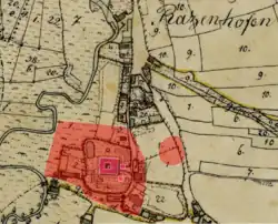 Es wird angenommen, dass hier ab dem Ende des 11. Jahrhunderts eine Befestigungsanlage bestand; vermutlich war dies eine auf einem pyramidenstumpfartigen Hügel stehende Motte. Dies war also die erste von den Herren von Ratzenhofen errichtete hochmittelalterliche Niederungsburg. Von dieser sind noch Teile des Wassergrabens erhalten. Zu Beginn des 20. Jahrhunderts waren noch alle vier Seiten des Grabens vollständig erhalten und eine Zugbrücke führte zu dem Schloss. Die Wehranlage hatte ein Ausmaß von 100 × 100 m; der durch den Grabenaushub erhöhte Burgbereich machte 40 × 40 m aus. Vermutlich wurde der Graben vom Wasser der Abens gespeist, aber seit spätestens 1778 befindet sich darin kein Wasser mehr.