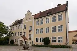 „Ehemals Schulhaus, jetzt Rathaus, dreigeschossiger, traufseitiger Steilsatteldachbau mit geschweiften Giebeln und flachem Mittelrisalit mit geschweiftem Giebel, 1903, Untergeschosse und Keller im Kern vom ehemals kurfürstlichen Schloss des 17. Jahrhunderts;