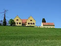 Anfangs bestand das Schloss aus zwei aneinandergebauten Gebäuden. Die Giebel sind als so genannte Treppengiebel ausgestaltet.[2] Der ursprünglich überdachte Turm ist mit Zinnen bewehrt. Am Schloss befindet sich auch eine der Heiligen Maria geweihte Schlosskapelle. Die Schlosskapelle besteht aus einem Oratorium und einer Sakristei. An der Zufahrt zum Schloss steht eine Pestsäule. Die ursprüngliche Säule wurde durch einen umstürzenden Baum zerstört, und heute steht an ihrer Stelle eine identische Kopie. Diese mit einem Kupferdach versehene Kopie ist mit Obst- und Blumengirlanden ausgestaltet, und in den vier Nischen sind Heiligenfiguren angebracht. Die Figuren stellen den Heiligen Sebastian, den Heiligen Urban, den Heiligen Franziskus sowie den Heiligen Antonius dar. Etwas abseits des Schlosses befindet sich das Mausoleum der Familie Haan.[1]