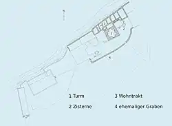 Die Tankzisterne im Hof stammt vermutlich aus dem Mittelalter. Sie ist vom Keller des Wohntraktes durch einen unterirdischen Gang zu erreichen. Der barocke Rundturm über der Zisterne stammt aus dem 17. Jahrhundert. Auch in den übrigen Gebäuden dürften noch Mauerreste der ursprünglichen Bausubstanz erhalten sein; am ehesten in der Aussenmauer der Nordseite. Die zinnenbewehrte Ringmauer auf der Südseite ist neuzeitlich und am Eingangstor mit der Jahrzahl 1792 versehen. Von einem im Nordosten angelegten Halsgraben ist infolge von späteren Aufschüttungen nichts mehr zu erkennen[3]
