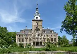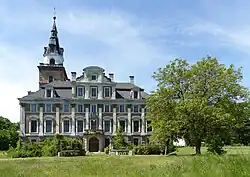 Das Barockschloss war eine vierflügelige Anlage auf quadratischem Grundriss mit einem mächtigen Turm im Südflügel. Bemerkenswert ist die bis ins 20. Jahrhundert erhaltene barocke Struktur des Gartens. Das heutige Bild ist vom Stil der Neorenaissance geprägt, mit Kolossalpilastern, Dreiecksgiebeln, zweigeschossigen Zwerchhäusern, und Zierkaminen über dem Mansardendach.