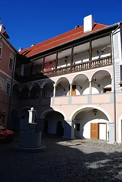 Der dreieckige Innenhof ist hakenförmig von zwei Gebäudeflügeln begrenzt. Beide Flügel sind gleich lang. Jener an der Nordseite zeigt dreigeschoßige, aber verschiedenartige Arkaden, die mit einem Bogen auf den Haupttrakt übergreifen. Der Haupttrakt zeigt hofseitig eine aufgemalte Sonnenuhr, die mit 1600 datiert ist.[1]