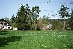 Der Keramikfabrik Villeroy & Boch gegenüber, am anderen Ufer der Saar, liegt die Gemarkung „Saarecks Ländchen“, eine Grünfläche im ehemaligen Ort Keuchingen. Der damalige Firmenleiter von Villeroy & Boch und spätere Bürgermeister Mettlachs, Eugen von Boch (1809–1889), erwarb den Grund und ließ ihn, der Mode der Zeit folgend, von dem Münchner Gartenarchitekten Carl Ludwig Seitz (1792–1866) im Jahr 1851 zu einem Englischen Landschaftsgarten gestalten. Dazu ließ er auch mehrere Bäume pflanzen, die heute noch markante Orte im Park bilden.[1] Vier Jahre später folgte hier auch ein Gestüt, dessen Gebäude noch heute existieren und der Parkverwaltung dienen.