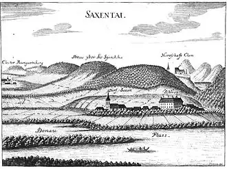 ![]() 1674 Dorf Saxen von Süden. Stich von Georg Matthäus Vischer.[1] Rechts unten der Schlossbau. | ||