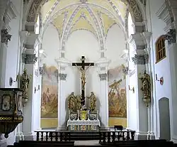 Bei einer Restaurierung im Jahr 1979 legte man im Chor zwei Wandfresken mit der Entkleidung und Kreuzigung Christi frei. Die um 1760/70 entstandenen Gemälde sind in der Art Ignaz Baldaufs ausgeführt. Dazwischen steht auf dem Choraltar eine bewegte Kreuzigungsgruppe (um 1730/40).
